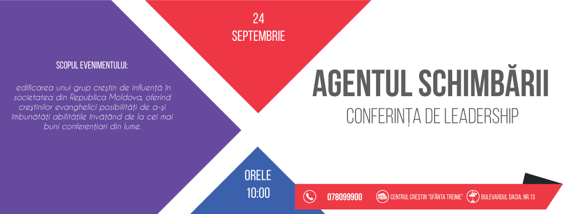 Te provocăm să excelezi şi să-L onorezi pe Dumnezeu prin excelenţă. Te aşteptăm cu drag în armata „Agenţilor Schimbării” sâmbătă, 24 septembrie, ora 10:00 la Centrul Creştin „Sfânta Treime” de pe Bulevardul Dacia 13.