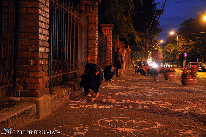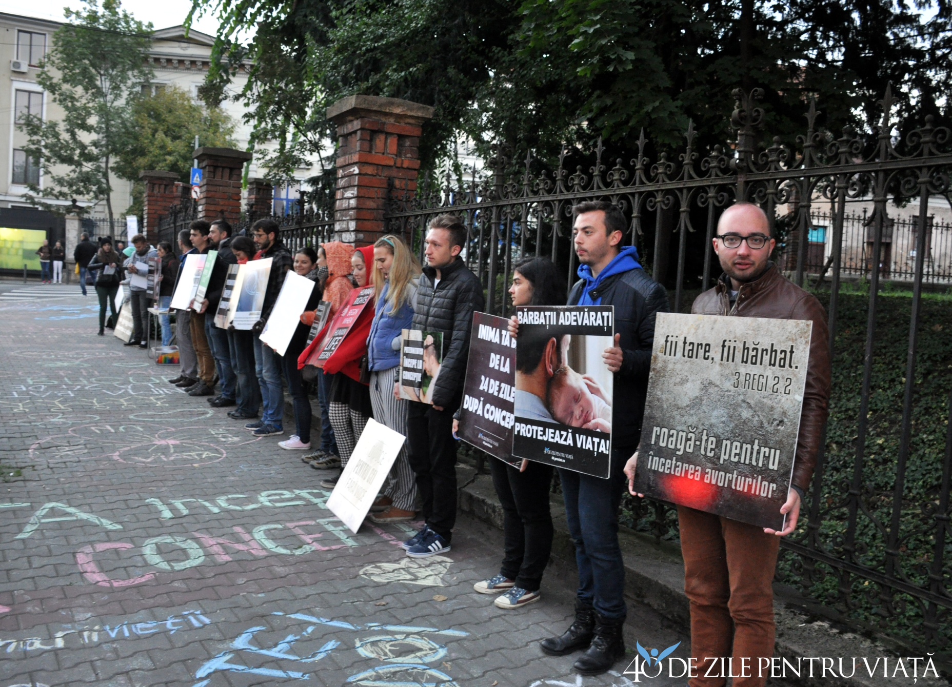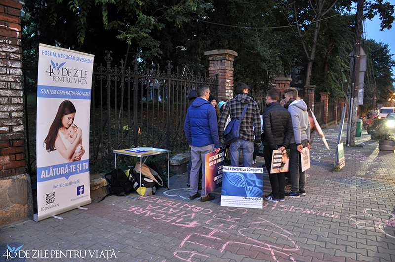 Misionarii vieții invadează Clujul, atenționează unul dintre mesajele colorate pe care trecătorii le pot citi astăzi, pe strada Clinicilor din Cluj-Napoca. Prima zi de veghe pentru încetarea avorturilor a început, în fața Clinicii de Ginecologie I, cu 18 suflete unite în rugăciune și hotărâte să lupte pentru viață. Chiar înainte de ora deschiderii, tinerii au împânzit trotuarul cu mesaje pro-viață, pentru ca acțiunea lor să fie și mai vizibilă. Pancarte noi și-au făcut apariția dis-de-dimineață: „Femeile au nevoie de ajutor, nu de avort”, „Merit să lupți pentru mine”, „Paternitatea începe la concepție”. În zorii zilei, a fost rostită prima rugăciune, iar cele 480 de ore de veghe care se vor desfășura aici au început.