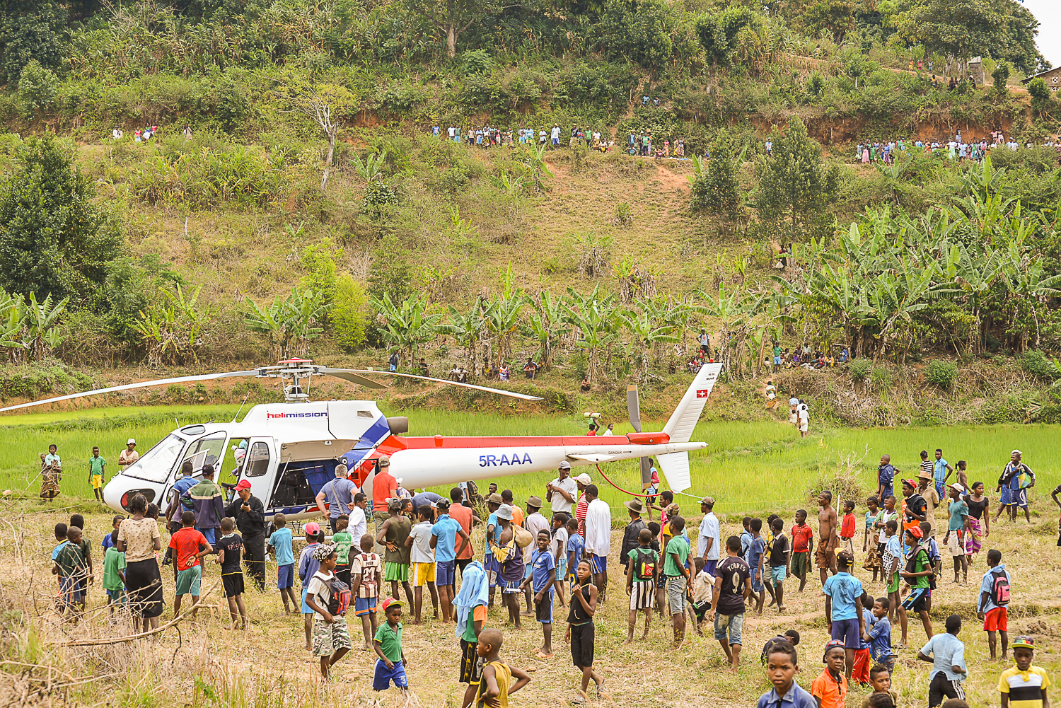 Am fost așa de încântați și mulțumitori că am ajuns în sfârșit în acest sat, în Ambohimana. Am aterizat într-o orezărie uscată, iar oamenii au început să curgă de pe dealuri ca șiroaiele de apă torențială în timpul ploii.