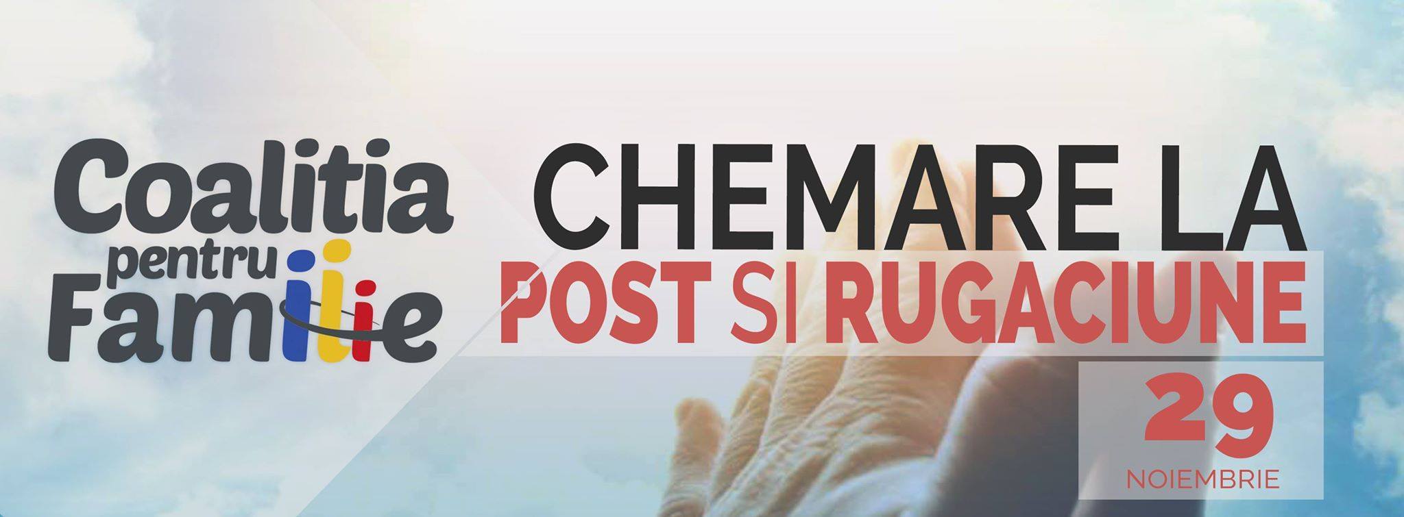 În data de 27 Octombrie, Curtea Constituţională a României a amânat decizia privind recunoaşterea în România a căsătoriilor homosexuale încheiate în străinătate aşa că vă chemăm din nou la o zi de post şi rugăciune în data 29 noiembrie 2016, zi în care CCR ar trebui să se pronunţe.
