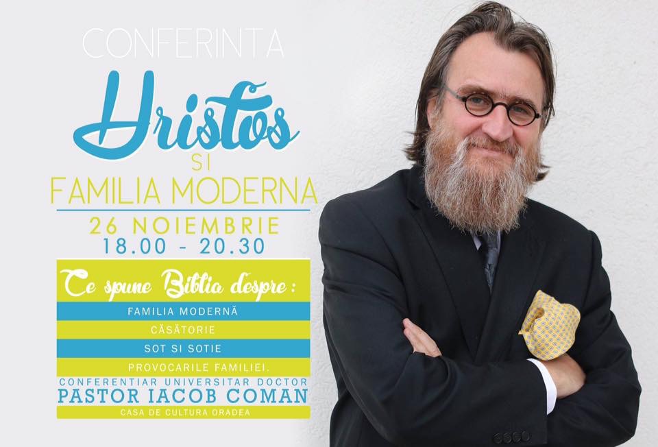 Vrei să știi ce spune Biblia despre familia modernă? Despre uniunea dintre un bărbat și o femeie? Despre soț și soție? Vrei să știi cum să faci față provocărilor pe care le are familia din zilele noastre? Vino la Conferința Cristos și Familia Modernă! Pastorul Iacob Coman vine cu răspunsurile biblice pentru toate dilemele.