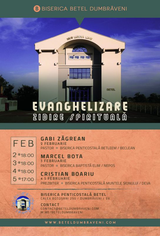 Tradiţional, în luna februarie, Biserica “BETEL” din Dumbrăveni, judeţul Suceava organizează slujbe speciale destinate evanghelizării şi creşterii în credinţă. Fiecare creştin din zonă este aşteptat împreună cu familia, vecinii, prietenii şi colegii de serviciu, pentru a împărtăşi bucuria mânturii împărtăşită prin Scripturi cu pastori, leviţi şi slujitori ai Evangheliei.