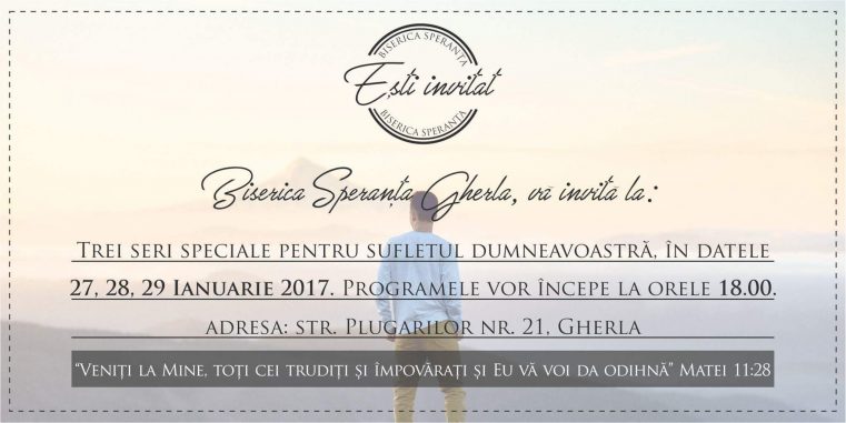 Într-o lume nebună, lipsită de pace, plină de ură, chemarea Domnului Isus “Veniţi la Mine, toţi cei trudiţi şi împovăraţi, şi Eu vă voi da odihnă” din Matei 11:28 este mai actuală ca niciodată. De aceea în perioada, 27-28 ianuarie, Biserica Penticostală “Speranţa” din oraşul Gherla, judeţul Cluj-Napoca invită împrejurimile la trei seri de Evanghelizare.