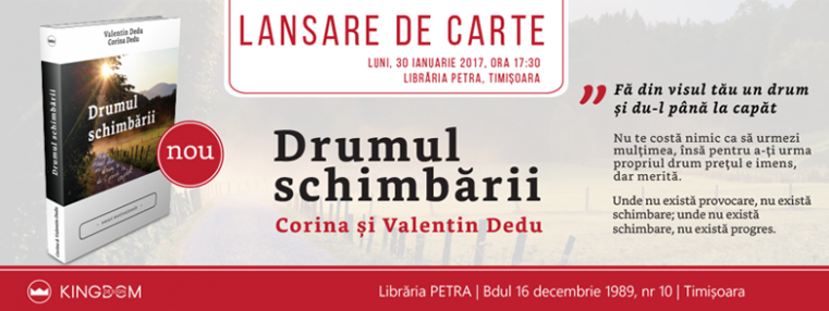 Vă invităm la un eveniment special pentru mine și soția mea Corina, lansarea cărții Drumul schimbării. Am publicat trei cărți până acum, însă nu am avut nici un eveniment public de lansare de carte. Nici nu știu de ce. Mi-a lipsit contextul, poate resursele, poate curajul, poate toate acestea… Oricum…, acum avem plăcerea să vă invităm la prima lansare de carte, o carte care reunește texte dragi sufletului nostru. Ocazia ne este oferită de librăria PETRA, o nouă librărie creștină din Timișoara. Îi mulțumim lui Gabi Ciuciumiș pentru invitație.