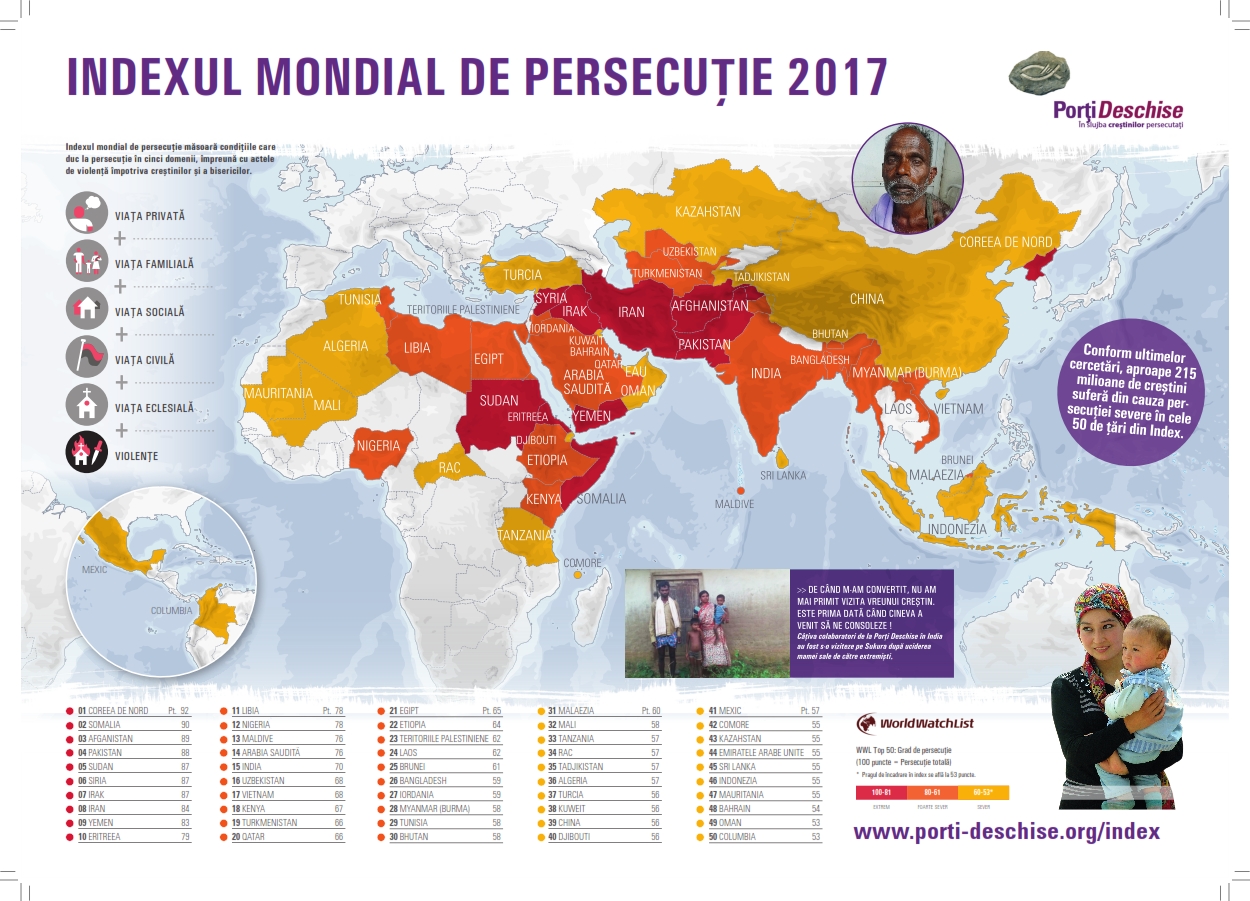 Coreea de Nord este în capul Indexului mondial de persecuție pentru a șaisprezecea oară consecutiv, și se izolează tot mai mult. Însă principalul motor al persecuției în lume rămâne islamismul, deasemenea cea mai mare parte dintre țări din Index se află în Orientul Mijlociu sau în Africa de Nord. Pentru a patra oara consecutiv, totalul punctelor a celor 50 de țări din index a urcat : de la 3299 în 2016 la 3355 în 2017. Aceasta reflectează vizibil o creștere a persecuției creștinilor în lume.