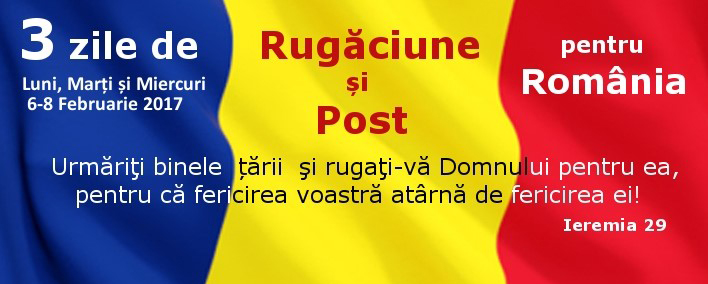 Țara noastră este foarte frământată în aceste zile, de aceea echipa Radio Vocea Evangheliei, vă cheamă la ”3 zile de post și rugăciune pentru România”. Luni – Miercuri, 6-8 Februarie.