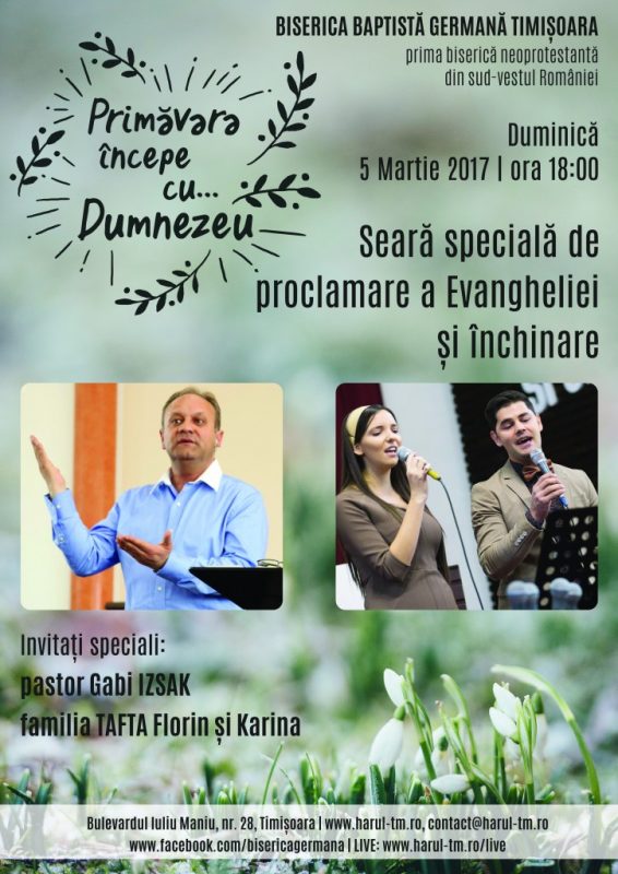 Începe primăvara, anotimpul renașterii! O primăvară pentru natură și una pentru suflet! În multe biserici evanghelice, aceasta este perioada în care sunt organizate întâlniri speciale de proclamare a Evangheliei și de închinare. Și la Biserica Baptistă Germană din Timișoara, primăvara începe cu… Dumnezeu! Cu această dorință în inima noastră și cu acest îndemn pentru voi toți, vă invităm împreună cu noi în fiecare duminică seara a lunii martie pentru a ne apropia de Dumnezeu prin Scriptură, prin rugăciune și închinare.