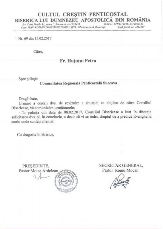 Printr-un nou comunicat, Consiliul Bisericesc al Cultului Creștin Penticostal din România îl repune în dreptul de a vesti Evanghelia pe fratele Huțuțui Petru.