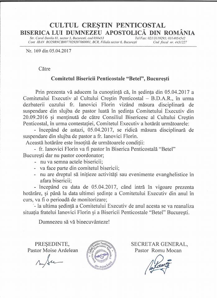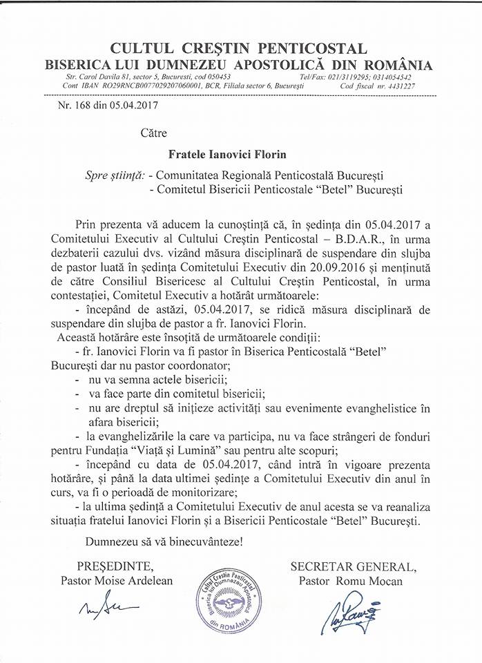 Prin decizia conducerii penticostale mi s-a interzis (vezi foto 1) să inițiez evanghelizări în afara bisericii Betel. Pot predica la Betel, dar nu am voie să inițiez evanghelizări în afara bisericii. În urechi îmi răsună porunca Mântuitorului: Marcu 16:15 “Apoi le-a zis: „Duceţi-vă în toată lumea şi propovăduiţi Evanghelia la orice făptură. ” Cum pot ajunge în toată lumea stând la Betel? Dumnezeu mi-a încredințat o viziune: misiunea Renovatio. Înainte de suspendare am ieșit în afara granițelor bisericii și am organizat evanghelizări cu tineri inimoși și dăruiți în incinta complexului Romexpo, sala Mihai Eminescu. Acum conducerea penticostală îmi interzice acest lucru. Fără explicații.