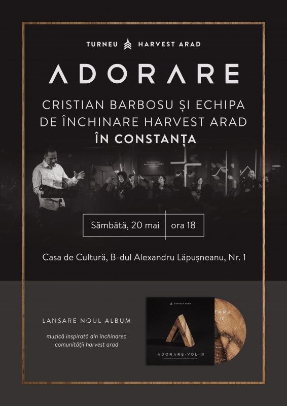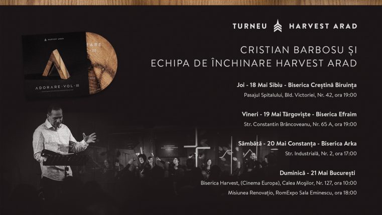În perioada 18-21 mai, echipa de închinare a Bisericii Harvest Arad împreună cu fratele Cristian Barbosu va fi în Sibiu, Târgoviște, Constanța și București: