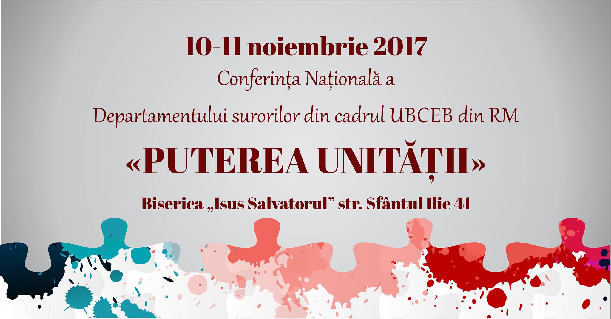 Tradiţional, femeile din Comunitatea Baptistă din Republica Moldova îşi dau întâlnire odată pe an la cel mai important eveniment de creştere spirituală – Conferinţa Naţională. Ediţia 2017 se va desfăşura sub genericul „Puterea Unităţii” şi va fi găzduită de Biserica „Isus Salvatorul” din Chişinău în perioada 10-11 noiembrie.