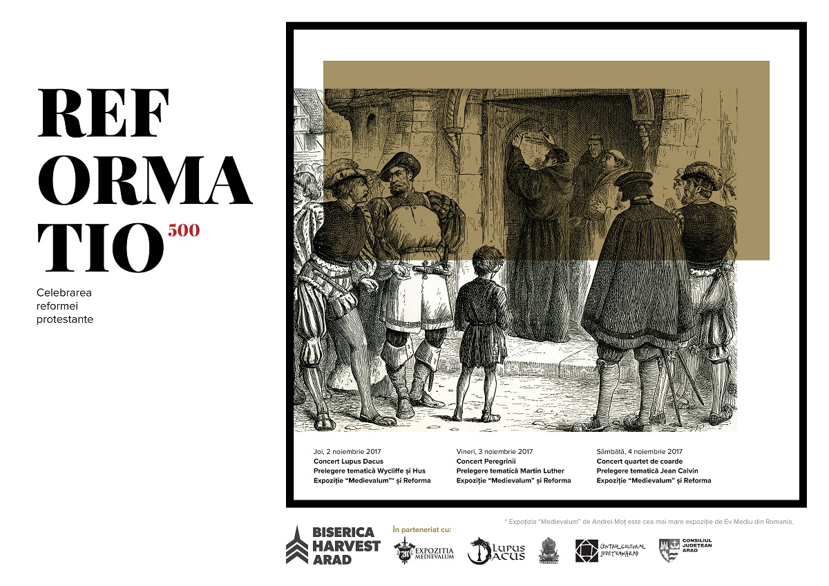 Călătoreşte în timp alături de Biserica “Harvest” Arad prin intermediul a trei evenimente comemorative. Cu această ocazie vor fi expuse imagini şi texte care ne vor ajuta să înţelegem ce s-a întâmplat atunci. Toate acestea vor fi însoţite de prezentări documentate ale principalilor reformatori şi ale influenţei lor asupra doctrinei şi practicii protestante.