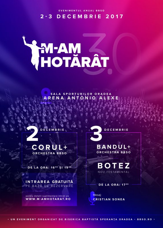 Primul week-end din decembrie este marcat de o serie de evenimente dedicate tinerilor din comunitatea evanghelică. Unul de marcă este Conferinţa Anuală a Bisericii Baptiste „Speranţa” din Oradea. Tema evenimentului 2017 este: „M-am Hotărât 3.0”.