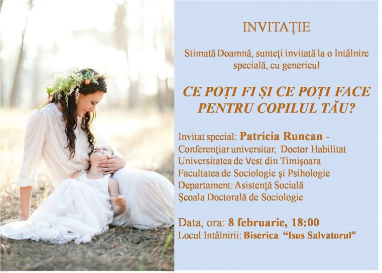 Joi, 8 februarie, femeile din raza orașului Chișinău, Republica Moldova sunt invitate la o seară specială cu conferențiar universitar și doctorul habilitat, Patricia Runcan. Discutăm cu invitata specială a serii despre „Ce poți fi și ce poți face pentru copilul tău”.