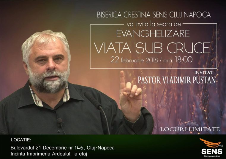 Joi, 22 februarie, ora 18, Biserica Creștină Sens din Cluj-Napoca vă invită la o seară de evanghelizare cu pastorul Vladimir Pustan. Gazda evenimentului este Imprimeria Ardealul situată pe bulevardul Decembrie 146.