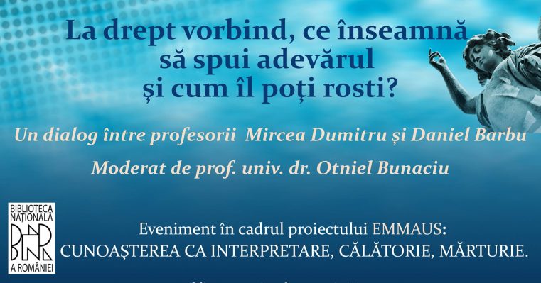 Marți, 20 februarie 2018, de la ora 18:00, la Biblioteca Națională (spațiul Pergament, parter) va avea loc dezbaterea “La drept vorbind, ce înseamnă să spui adevărul şi cum îl poţi rosti?“, în care profesorii Mircea Dumitru şi Daniel Barbu vor încerca să formuleze răspunsuri la întrebări precum: Există adevăr? Cum putem defini adevărul obiectiv? Cum putem stabili faptele în lumina adevărului? Ce înseamnă să spui adevărul? Care este raportul dintre opinie şi adevăr, expertiză şi adevăr, credinţă şi adevăr? Moderator: prof. univ. dr. Otniel Bunaciu.