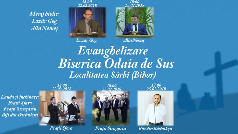 În perioada, 22-25 februarie, Biserica „Odaia de Sus” din localitatea Sârbi, județul Bihor invită localnicii la trei seri de evanghelizare. Startul evenimentului este dat joi, de pastorul Lazăr Gog, alături de frații Sfara.
