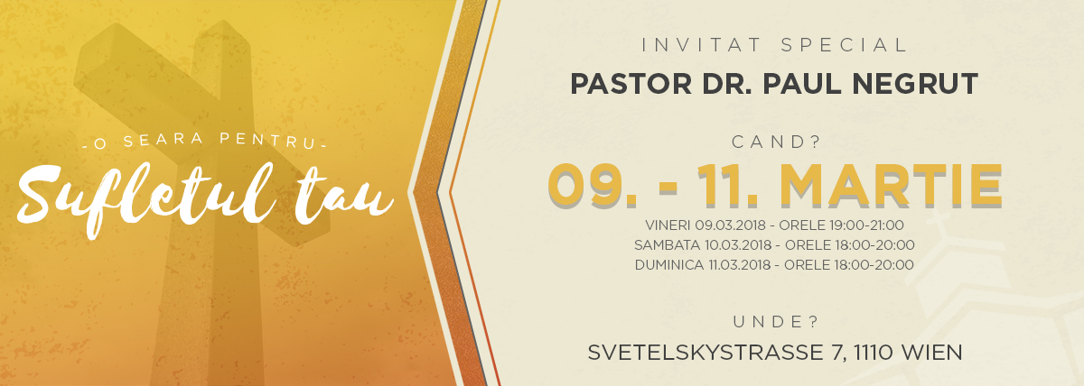În perioada, 09-11 martie, Biserica Baptistă „Bethel” din Viena organizează trei seri de evanghelizare. Invitatul evenimentului cu genericul „O seară pentru sufletul tău” este Paul Negruț, pastorul Bisericii „Emanuel” și rectorul Universității „Emanuel” din Oradea.