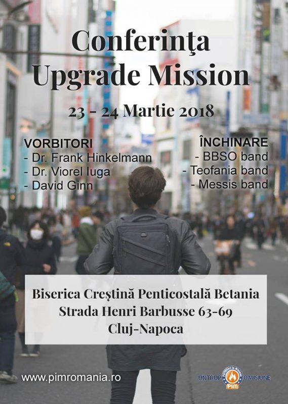 Trăim într-o lume în continua schimbare, o lume în care ne dorim să fim relevanți. O lume care are nevoie de tineri devotați, oameni care înțeleg chemarea pe care o au de la Dumnezeu! Rețeaua Parteneri în Misiune (PIM) provoacă tânăra generație și invită la prima Conferință „Upgrade Mission”. Evenimentul este găzduit în perioada, 23-24 martie de Biserica Penticostală „Betania” din Cluj-Napoca.