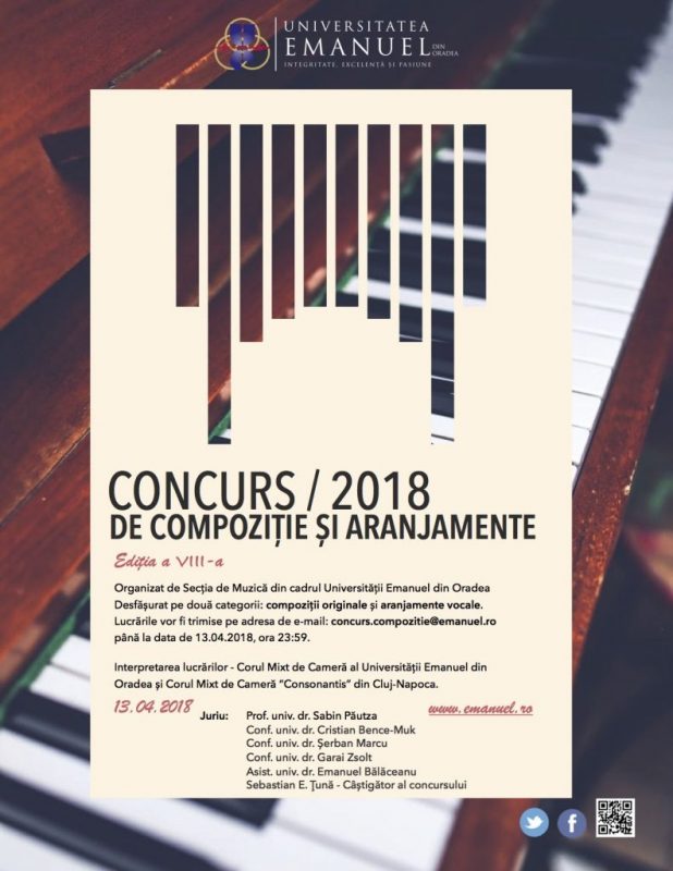 Secția de Muzică din cadrul Facultății de teologie a Universității „Emanuel” din Oradea invită tinerii muzicieni cu vârsta până la 36 de ani să participe la cea de-a VIII-a ediție a Concursului de Compoziție și Aranjamente. Dacă ești pasionat de muzică, compoziție, tot ce e frumos și sună bine pe note muzicale, pune în negoț talantul tău și promovează-ți creațiile.