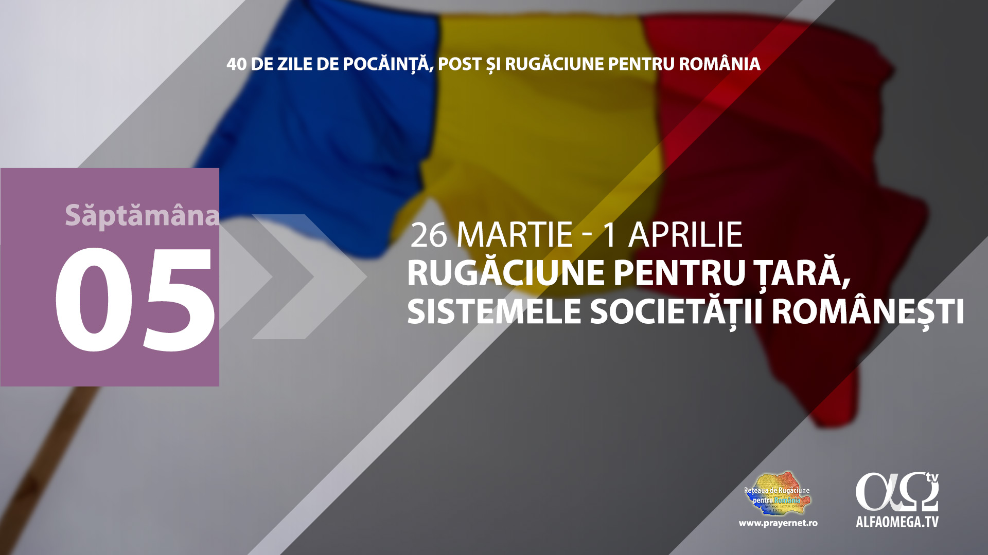 Intrăm pe ultima sută de metri a Campaniei 40 de zile de Post și Rugăciune pentru România. În Perioada, 26 martie – 1 aprilie, vă chemăm să ne rugăm pentru România – Pocăință pentru păcatele comise în sistemele în care este organizată societatea noastră: