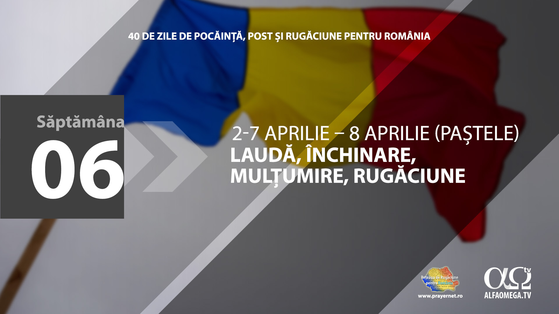 Pe ultima sută de metri a Campaniei de “40 de zile de Post şi Rugăciune pentru România”, vă chemăm să începem cu laudă şi adorare pentru jertfa măreaţă a Domnului Isus care a plătit preţul păcatelor noastre. În pragul învierii, haideţi să comemorăm moartea şi învierea Mântuitorului, prin care boldul morţii a fost rupt şi am fost înviaţi la o viaţă nouă. În săptămâna, 2-7 aprilie, aduceţi înaintea Creatorului următoarele motive de rugăciune: