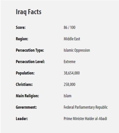 Există mai multe grupuri care persecută creştinii în Irak. Acestea sunt reprezentate de mişcări radicale islamiste care persecută alte minorităţi religioase, şi execută numeroase crime şi răpiri. Liderii islamici calomniază creştinii în mesajele pe care le predică la moschei, lucru care contribuie la creşterea persecuţiei. Autorităţile guvernamentale, atât cele locale cât şi cele naţionale, ameninţă creştinii şi îi „încurajează” să părăsească ţara. Partidele politice au şi ele un rol în persecuţia creştinilor în spaţiul public prin mesajul lor anti-pluralism. În plus, creştinii care sunt convertiţi de la islam suferă o persecuţie intensă din partea familiilor, clanurilor şi a comunităţilor din care fac parte, iar membrii acestora pot recurge chiar la crimă pentru a-i pedepsi pe cei care au părăsit islamul. În acelaşi timp, liderii bisericilor creştine istorice din Irak zădărnicesc orice eforturi ale unor alte confesiuni creştine de a-şi stabili o prezenţă acolo.