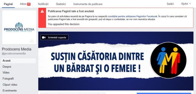Stimaƫi prieteni, Ȋncepând din această dimineaƫă Facebook a decis sa inchidă pagina Prodocens media fără nici un avertisment. Cu siguranƫă activităƫile noastre prin care apărăm şi promovăm valorile creştine şi mai ales implicarea noastră în Coalitia pentru Familie a deranjat elita progresistă şi mai ales pe activiştii LGBT.