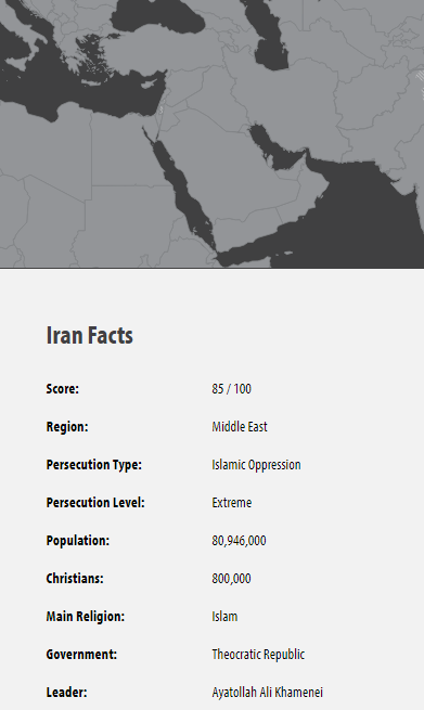 Persecuţia în Iran vine din partea autorităţilor care impun un regim islamic strict. Aproape toate bisericile care aveau slujbe în limba Farsi au fost închise iar liderii acestora arestaţi. Rugaţi-vă pentru creştinii care sunt în închisoare să aibă o credinţă puternică şi o dragoste arzătoare pentru Dumnezeu şi pentru sufletele celorlalţi deţinuţi şi ale gardienilor.