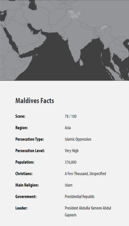 Guvernul din Maldive este angajat într-o luptă politică cu forţele opoziţiei, prin urmare orice posibilă ameninţare (inclusiv creştinismul) este stopată într-un mod rapid şi brutal. Clericii islamici radicali exercită o influenţă considerabilă asupra vieţii social-religioase, făcând aproape imposibil pentru creştini, în special noi convertiţi, să-şi practice credinţa fără a fi pedepsiţi sau monitorizaţi intens de către autorităţi.