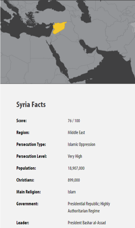În Siria creştinii sunt persecutaţi de către grupările islamice radicale, de către membrii propriilor familii, de autorităţi şi de liderii islamici. În iunie 2014, gruparea teroristă Stat Islamic (ISIS) a declarat partea de nord a Siriei ca făcând parte dintr-un aşa-zis califat islamic şi a început implementarea unei forme foarte stricte a legii Sharia.