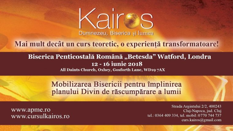 În perioada, 12-16 iunie 2018, Biserica Penticostală Română „Betesda” Watford, Londra găzduiește desfășurarea Cursului Kairos. Diaspora este provocată să trăiască acea mobilizare transformatoarea pentru împlinirea planului Divin de răscumpărare a lumii.