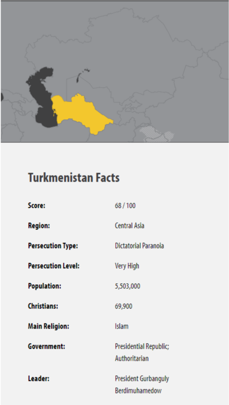 Toate activităţile creştine din Turkmenistan sunt monitorizate intens de către stat. Raziile asupra caselor unde există adunări de creştini neautorizate sunt la ordinea zilei, iar credincioşii sunt ameninţaţi, arestaţi, amendaţi şi trimiși la închisoare. Materialele religioase sunt confiscate ca fiind marfă de contrabandă.