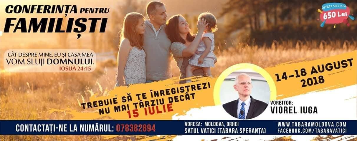 Sub motto-ul: „Cât despre mine, eu și casa mea vom sluji Domnului“, în perioada 14-18 august 2018, Tabăra „Speranța“ din Vatici, Orhei, Republica Moldova, găzduiește Conferința pentru Familiști 2018. Invitatul special al evenimentului este pastorul, autorul a peste 50 de titluri de carte pentru familie și președintele Uniunii Baptiste din România, Viorel Iuga.