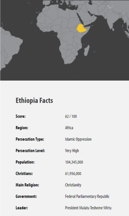 Pe timpul redactării raportului privind Topul Mondial al Persecuţiei, în anul 2017, au existat peste 100 de incidente de persecuţie cu violenţă împotriva creştinilor din Etiopia.