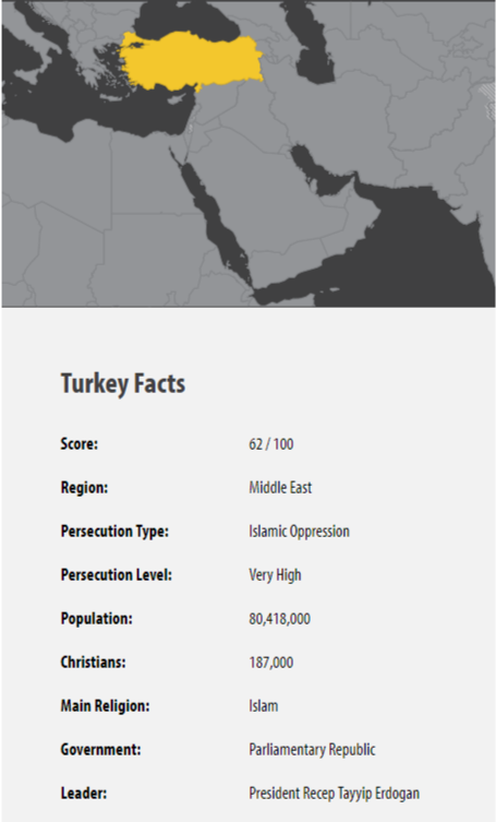 În Turcia, un amestec de religie islamică şi naţionalism radical reprezintă principalul factor de persecuţie a creştinilor. Dacă eşti turc este de aşteptat să fii musulman, iar aceasta concepție este intens promovată de autorităţi în efortul lor de a-şi consolida puterea. Turcia a trecut printr-o tentativă de lovitură de stat în iulie 2016, iar preşedintele Erdogan a folosit instabilitatea politică în avantajul său, încercând să unească turcii sub principiile islamului sunit. Minorităţile religioase nu au loc în societatea turcă, iar persecuţia creştinilor este o realitate. Convertiţii la creştinism întâmpină mari dificultăţi, în primul rând din partea propriilor familii, pentru că sunt consideraţi trădători ai islamului şi ai identităţii naţionale turce.