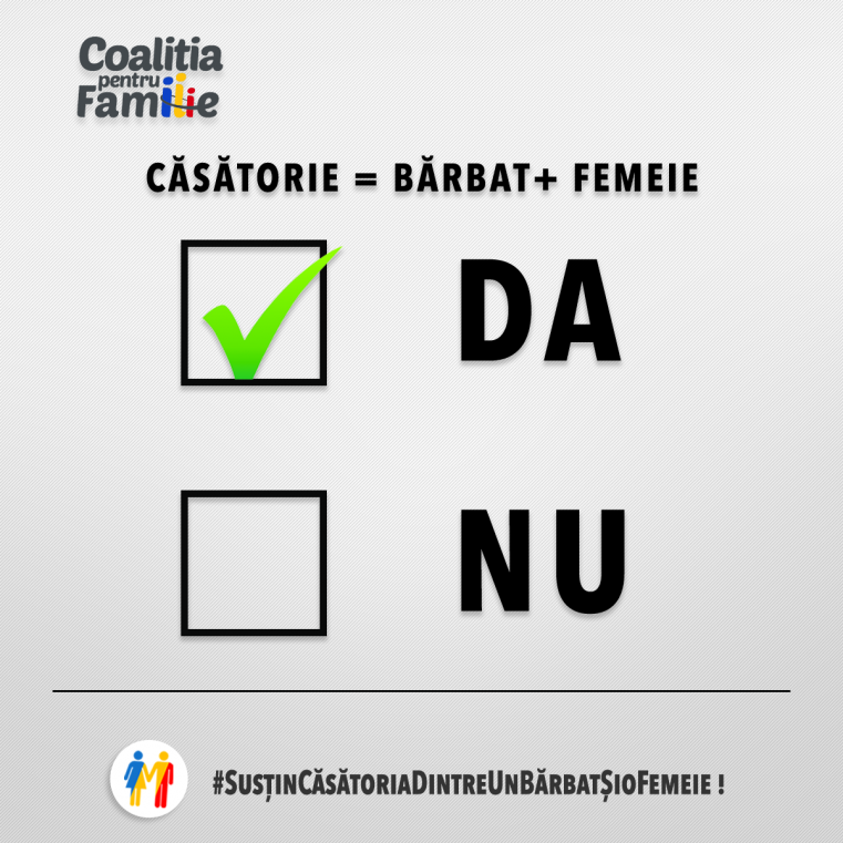 Definirea căsătoriei ca uniunea dintre un bărbat și o femeie în Constituția României va face ca lumea noastră, societatea noastră, viața noastră să poată prezerva adevărul civilizației noastre creștine. Să facem acest lucru posibil prin votul nostru!