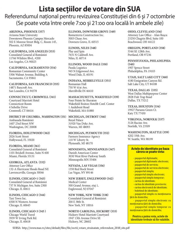 Referendumul pentru Familie, stabilit pentru 5-6 octombrie 2018, oferă șansa de a-și exprima votul și celor aflați în diasporă. Astfel românii aflați pe teritoriul Statelor Unite ale Americii își pot exprima votul în peste 32 de secții de votare, având la îndemână următoarele acte de identitate.