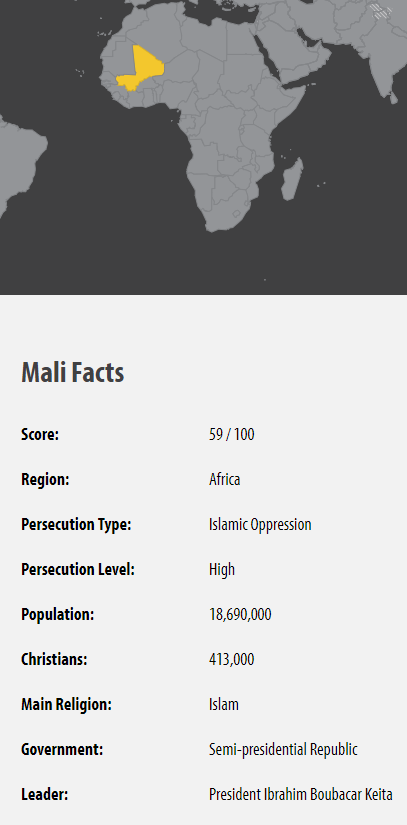 În mod istoric, cetăţenii din Mali au practicat o versiune relativ tolerantă a islamului, cu toate acestea, în ultimii ani, această țară din vestul Africii a devenit tot mai militantă şi intolerantă. În special, în partea de nord a ţării, aceasta intoleranță a dus la o intensificare a persecuţiei creştine.