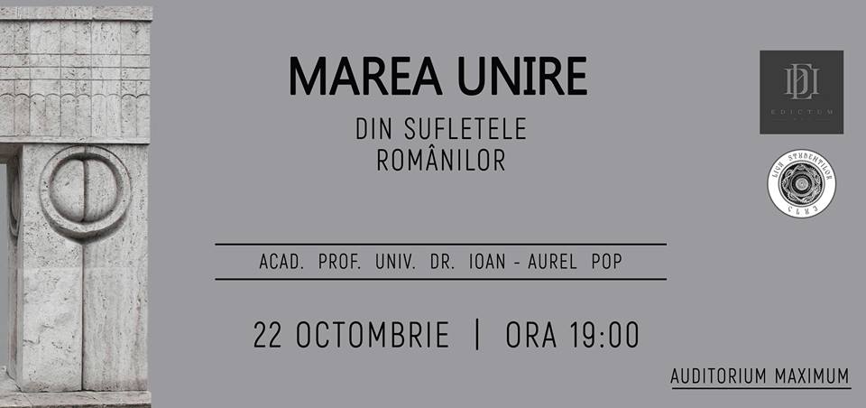 Edictum Dei și Liga Studenților din Cluj organizează luni, 22 octombrie, de la ora 19:00, conferința cu titlul „Marea Unire din Sufletele Românilor”. Invitatul special este Academicianul Prof. univ. dr. Ioan-Aurel Pop.