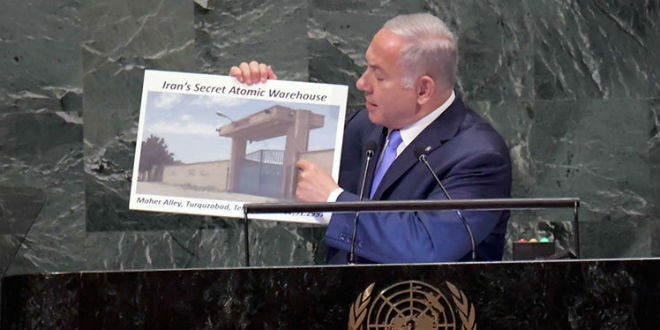 „Astăzi, dezvălui pentru prima dată că Iranul are o altă unitate secretă în Teheran – un depozit atomic secret pentru stocarea unor cantități masive de echipamente și materiale din programul secret al Iranului privind armele nucleare. În luna mai, am expus site-ul arhivei atomice secrete a Iranului, chiar aici, în districtul Shor-abad din Teheran. Astăzi dezvălui site-ul celei de-a doua unități – depozitul atomic al Iranului. Este chiar aici, în districtul Turquz-abad din Teheran, la doar câteva mile depărtare”, a explicat la ONU, Netanyaju.