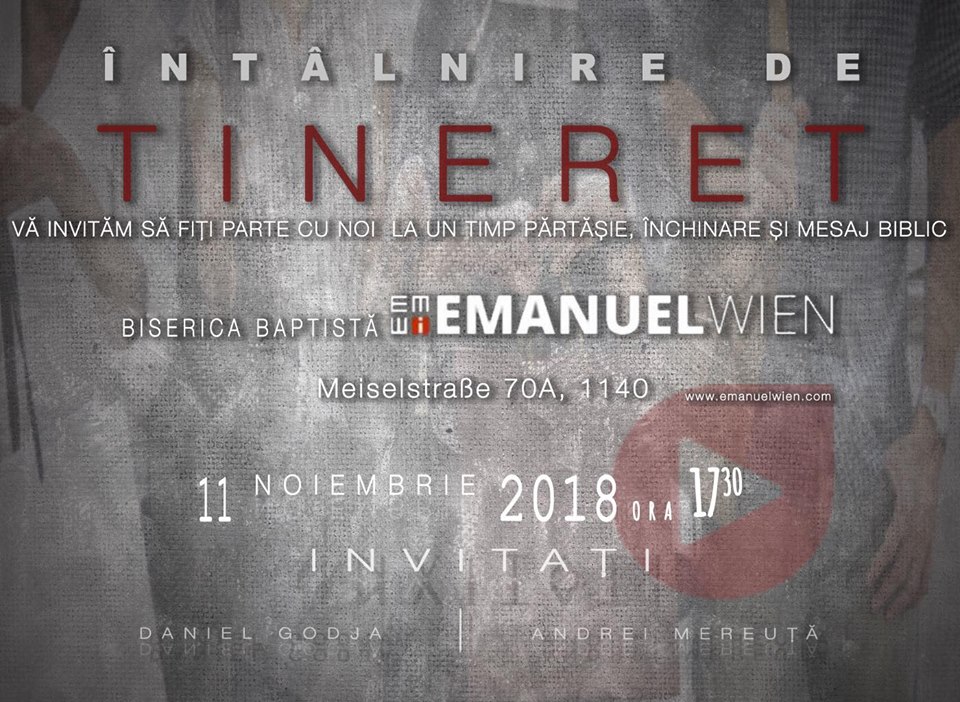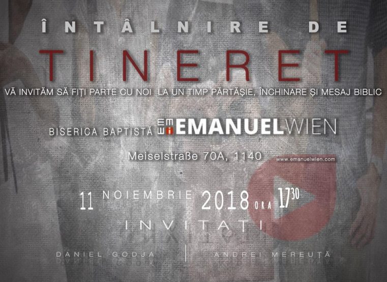 Duminică, 11 noiembrie, ora 17:30, Biserica Baptistă Emanuel din Viena invită toți tinerii români din diasporă la o Seară Specială de Tineret! În meniul serii, veți avea parte de închinare alături de grupul de laudă și închinare a bisericii locale și mesaje din Cuvântul Inspiral și Infailibil al lui Dumnezeu.