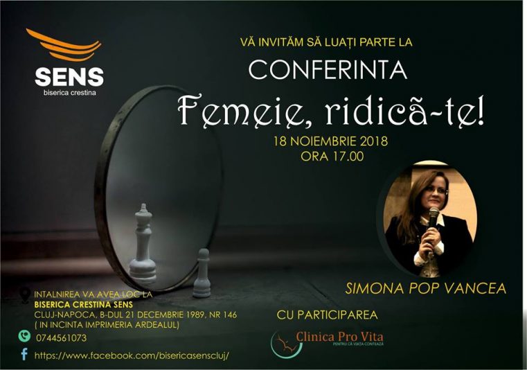 Duminică, 18 noiembrie, Biserica Sens invită femeile de orice vârstă și din orice denominațiune la o un eveniment unic. Conferința „Ridică-te, femeie!” este un mesaj ce vizează problemele reale cu care femeile din mediul creștin se confruntă astăzi. Evenimentul provoacă femeile din această generație să găsească soluții în Cuvântului lui Dumnezeu, cu vorbitoarea Simona Pop Vancea.