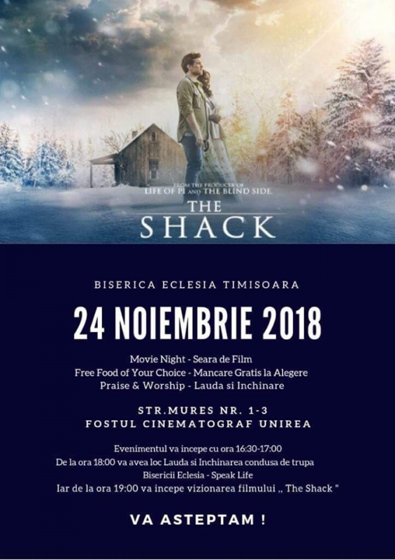 Seară de film la Biserica Eclesia din Timișoara. The Shack – Baraca – este povestea unui tată, Mack Philips, care datorită evenimentelor tragice din viața lui, se afundă într-o depresie profundă, determinându-l să pună la îndoială convingerile sale cele mai intime. În timp ce se confruntă cu o criză a credinței, Mack primește o scrisoare misterioasă, îndemnându-l să meargă la o baracă abandonată în adâncul pustiului Oregon.