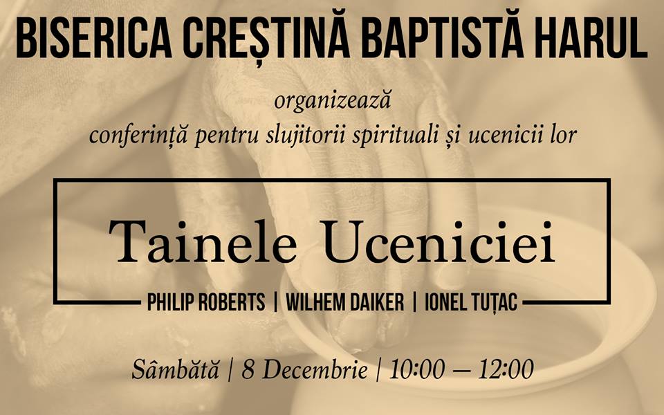 Sâmbătă, 8 decembrie, Biserica Baptistă Harul din Lugoj găzduiește Conferința pentru slujitori și ucenicii lor cu tema: „Tainele Uceniciei”. Evenimentul se desfășoară în intervalul orelor 10:00-12:00, str. Plopilor nr.10, Lugoj 305500, România.