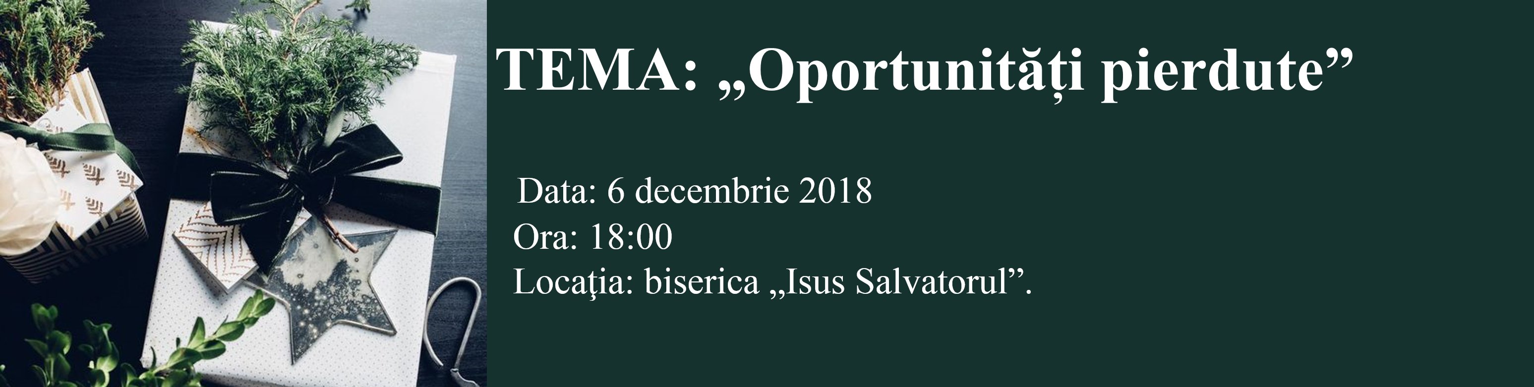 În ultima întâlnire a femeilor din 2018, departamentul surori din cadrul Bisericii “Isus Salvatorul” din Chișinău a pregătit o seară specială cu tema: “Oportunități pierdute”. Joi, 6 decembrie, ora 18:00, în perioada de advent femeile din Chișinău sunt provocate să participe la o întâlnire unde să se pregătească minuțios pentru evenimentul Nașterii Domului.
