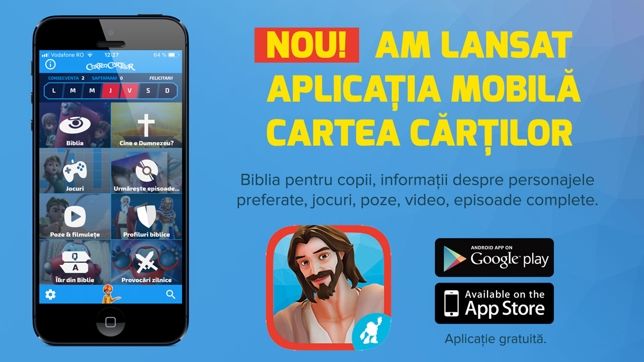 După doi ani de muncă asiduu, un nou produs marca Cartea Cărților în limba română, devine realitate. În colaborare cu The Christian Broadcast Network, partenerul oficial în România Alfa Omega TV lansează aplicația Cartea Cărților pentru Android și iOS, disponibilă acum pe tablete și telefoane. Descărcați acum pe dispozitivele dvs aplicația din Play Market sau pe APP STORE, și lăsați copii să pornească în cea mai captivantă aventură!