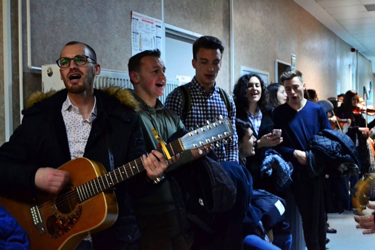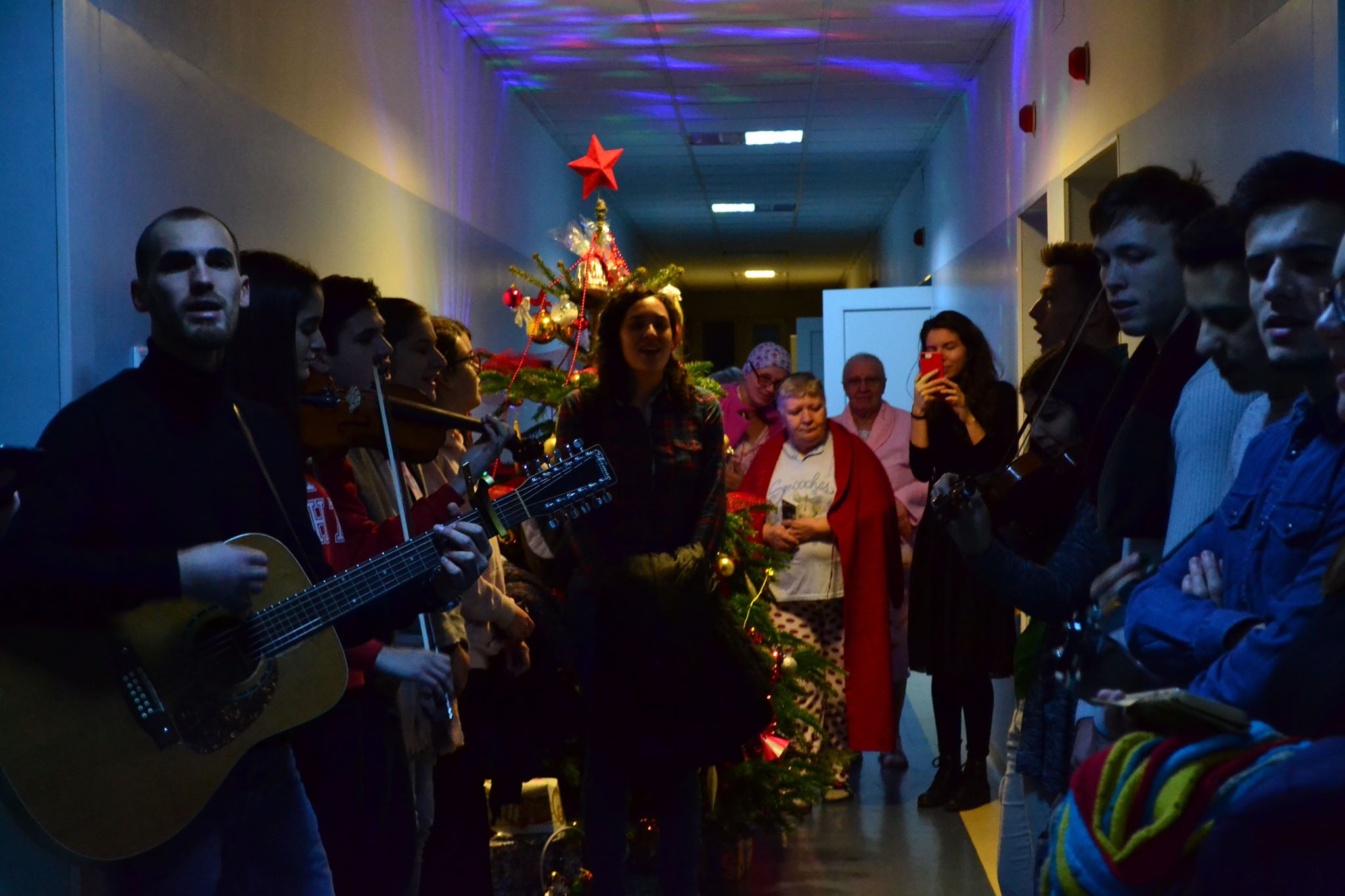 „Holuri de spital pustii. Liniște. Nimeni nu se așteaptă la ce o să urmeze. Noi intrăm și ne aliniem pe marginile culoarului. Unii dintre noi merg din salon în salon să anunțe pacienții că am venit să le aducem vești bune… prin cântec! Cei care se pot deplasa ies din saloane și ne privesc curioși. Începem să cântăm. Tot mai mulți ies. Mulți ne filmează, cu ochii plini de lacrimi, cu sufletul inundat de bucurie. Poate ne filmează ca cei care nu s-au putut deplasa să ne vadă și ei, măcar astfel. După fiecare colind, aplauze, felicitări pentru ceea ce facem! Vor să ne onoreze în mod tradițional, posibilități. Bineînțeles nu primim nici un ban. Doar câteva fructe, la insistențele vehemente ale câtorva paciente. Astfel de mulțumiri sincere, rar îți e dat să primești. Expresia fețelor lor, bucuria care apare pe fețele transfigurate de boală, e ceva ce nu vom uita, nu putem uita! Tocmai oamenii aceștia, care au gustat din plin suferința, ne vorbesc despre micile bucurii, ei știu că acestea sunt de fapt cele mai importante. Și ce preț greu au avut de plătit pentru a ajunge la înțelepciunea aceasta! Am mers acolo cu gândul să dăruim din ce avem, timp, energie, bucurie, inimi înălțate în cântec. Am plecat de acolo cu timpul investit, cu energie sporită, cu inimi pline de bucurie. Am vrut să dăruim dar am primit înmiit. Am plecat mai bogați! A meritat investiția! Slavă Domnului pentru astfel de ocazii! Am văzut oameni în scaune cu rotile, oameni care se ajutau de bastoane pentru a se deplasa, oameni cu sufletele îngenunchiate de boală care zâmbeau printre lacrimile calde care li se prelingeau pe obraji. Astfel de mulțumiri, astfel de binecuvântări, astfel de urări ca cele primite de la acei oameni, cărora le-am cântat pentru câteva minute, dar în care sperăm că au simțit un strop de veșnicie, astfel de cuvinte ca ale acelor oameni, care au gustat din plin ce înseamnă suferința, nu vom mai auzi în altă parte. Ei trăiesc greutăți de neimaginat, ei gustă o porție prea mare din ce înseamnă suferința, însă tocmai ei sunt cei mai capabili să ne îndemne pe noi toți să prețuim micile bucurii. Am fost acolo să dăruim bucurie, dar noi suntem cei care am plecat mai bogați, mai încurajați!”, ne-a împărtășit cu emoții Esther Pârvu, studentă în anul patru la medicină generală.