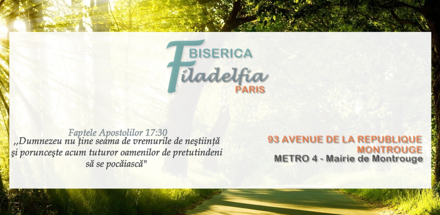 Biserica Creștină Penticostală „Filadelfia” din Paris, te invită, începând de vineri, 22 februarie până duminică, 24 februarie, să iei parte la trei seri speciale de evanghelizare, unde se va vesti Cuvântul Domnului. Alături de cei care vor aduce mesajul mântuirii va fi fratele Călin Turcu, iar Daniel Constanda și grupurile locale precum fanfara, orchestra și corurile Bisericii vor slăvi pe Domnul prin cântare.