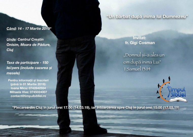 Asociația Creștină Timpul Bibliei organizează conferința pentru bărbați „Un bărbat după inima lui Dumnezeu”. Evenimentul va fi găzduit în perioada, 14-17 martie 2019, de Centrul Creștin Onisim, Moara de pădure, Cluj.